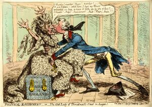 The bank's headquarters have been in London's main financial district, the City of London, since 1694, and on Threadneedle Street since 1734. It is sometimes known as "The Old Lady of Threadneedle Street", a name taken from a satirical cartoon by James Gillray in 1797.[8] The road junction outside is known as Bank Junction.