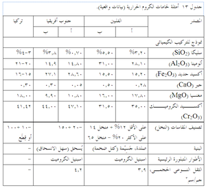 خامات الكروم مشمولة في صيغة (Mg•Fe+2) (Cr,Al,Fe+3)2O4 حيث يمكن أن يحل المغنسيوم بديلا عن الحديد والألومنيوم عن الكروم. والمعادن الزائدة التى يقال لها عادة الشوائب المعدنية غالبا ما ترتبط بهذه الخامات. وتسهم الشوائب المعدنية بالسليكا المتبقية والجير والمغنسيا الإضافية إلى خام الكروم. التحكم والوضع وكمية الشوائب المعدنية لا تقل أهمية للخصائص النهائية للحراريات عن التركيبة الكيميائية الأساسية للخام. غالبا ما تتم ترقية الخامات بواسطة تقنيات الفصل الميكانيكى للتقليل من الشوائب. ومن ثم فمركزات الكروم ذات الشوائب المنخفضة، كما هو مبين في جدول 13، هى غالباً المادة التجارية المستخدمة في الحراريات. وCr2O3 النقى المفصول كيميائيا من الكروميت يمكن أن يستخدم في تركيبة مع أكاسيد أقل تكلفة لانتاج خصائص حرارية محددة.