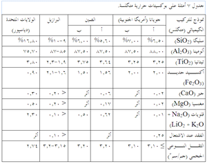 البوكسيت. البوكسيت bauxite في حالته الخام هو مجموعة من المعادن الموجودة طبيعياً، تتكون أساساً من الجبسيت (Al2O3•3H2O) أو الدياسپور أو البيوميت (AlO(OH)) بالإضافة إلى أطيان متنوعة. البوكيستات الحرارية المتكلسة موجودة في صور محددة كما في جدول 7، وتُنْتَج من خامات منخفضة الحديد ومنخفضة السليكا خلال عمليات تكليس، تتم في قمائن دوارة أو قمائن بتيار سحب سفلى. يتم التكليس في مدى درجات حرارة من 1400-1800 ْم، ويتم فيه تحويل البوكسيت الخام إلى معادن الكورندم والموليت، وكلاهما مكونان شديدا المقاومة للحرارة. ومن الخصائص الهامة للبوكسيتات احتواؤها على أقصى نسب للألومينا (85% أو أكثر)، وأقصى كثافة حجمية، وأدنى شوائب مثل أكسيد الحديد والتيتانيا والقلويات (Na2O وK2O وLiO2)، والعناصر الأرضية القلوية (الأتربة القلوية) (CaO وMgO).