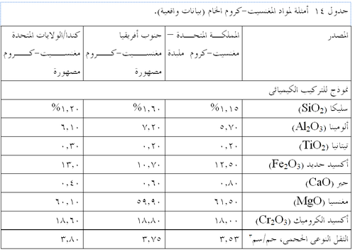 بالإضافة إلى المواد الخام الحرارية القاعدية المكونة من المغنسيا تامة الحرق وخام الكروم كمواد أولية، هناك تركيبات أخرى من المغنسيت-كروم ضمن هذه السلسلة، فمجموعة مواد المغنسيت-كروم الخام موجودة أيضاً وتشمل المغنسيت-كروم المتكلسين معاً، والمغنسيت-كروم المصهور، والبيكروكروميت الاصطناعية وهى مزيج من المغنسيت وأكسيد الكروم. تظهر في جدول 14 تركيبات نموذجية للمغنسيت-كروم.