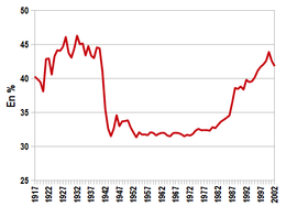 تطور نسبة الدخل ال10% الأكثر غنى، إلى مجموع الدخل الوطني الأمريكي، بين 1917 و 2002.