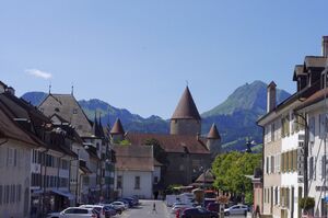 Downtown Bulle is made up of many shops and offices, a train/bus station (TPF) (with regular service to nearby Fribourg), and an old château that was converted into a prison. A sculpture of a bull sits in a traffic circle by the bus station, showing the emblematic animal for which Bulle is named.
