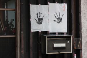 بصمة يد تحتفل بعيد الثامن والثمانين لميلاد شخص، معلقة عند المدخل، أواسي، محافظة ميه، اليابان). كانت هذه العادة منتشرة على نطاق واسع في منطقة كينكي، ولكنها اختفت بالفعل في العديد من المناطق.