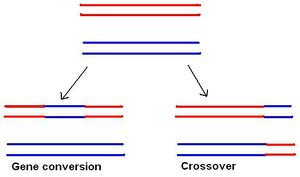 The difference between gene conversion and chromosomal crossover. Blue are the two chromatids of one chromosome and red are the two chromatids of another one.