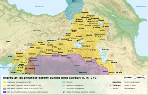 مملكة أورارتو ازدهرت بين القرن التاسع ق.م.[34] and 585 BC[35] in the Armenian Highland. The founder of the Urartian Kingdom, Aramé, united all the principalities of the Armenian Highland and gave himself the title "King of Kings", the traditional title of Urartian Kings.[36] The Urartians established their sovereignty over all of Taron and Vaspurakan. The main rival of Urartu was the Neo-Assyrian Empire.[37]