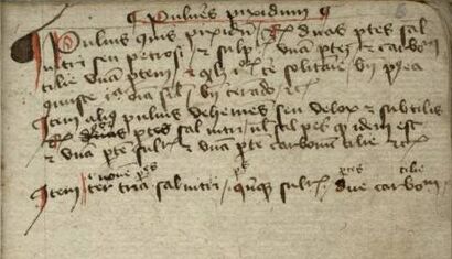 The oldest written recipes for gunpowder in Europe were recorded under the name Marcus Graecus or Mark the Greek between 1280 and 1300 in the Liber Ignium, or Book of Fires.[138] One recipe for "flying fire" (ignis volatilis) involves saltpeter, sulfur, and colophonium, which, when inserted into a reed or hollow wood, "flies away suddenly and burns up everything." Another recipe, for artificial "thunder", specifies a mixture of one pound native sulfur, two pounds linden or willow charcoal, and six pounds of saltpeter. Another specifies a 1:3:9 ratio.[139] The text is likely a translation from Arabic through a Spanish intermediary due to the terminology used and recipes for items found in 12th century Arabic texts.[140]