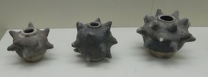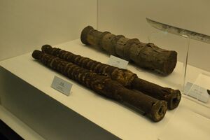 Shortly after the Mongol invasions of Japan (1274–1281), the Japanese produced a scroll painting depicting a bomb. Called tetsuhau in Japanese, the bomb is speculated to have been the Chinese thunder crash bomb.[85] Archaeological findings by the Kyushu Okinawa Society for Underwater Archaeology confirmed the existence of bombs in the Yuan invasion's arsenal. Multiple bomb shells were discovered in an underwater shipwreck off the shore of Japan and X-rays of the excavated shells show that they contained gunpowder and were also packed with scrap iron.[86][87] Japanese descriptions of the invasions also talk of iron and bamboo pao causing "light and fire" and emitting 2–3,000 iron bullets.[88] The Nihon Kokujokushi, written around 1300, mentions huo tong (fire tubes) at the Battle of Tsushima in 1274 and the second coastal assault led by Holdon in 1281. The Hachiman Gudoukun of 1360 mentions iron pao "which caused a flash of light and a loud noise when fired."[89] The Taiheki of 1370 mentions "iron pao shaped like a bell."[89]