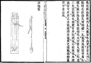 An illustration of fire arrow launchers as depicted in the Wubei Zhi (1621). The launcher is constructed using basketry.