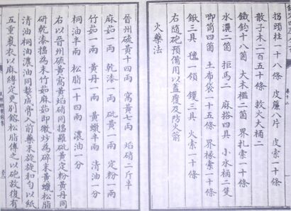 The earliest surviving chemical formula of gunpowder dates to 1044[18] in the form of the military manual Wujing Zongyao, also known in English as the Complete Essentials for the Military Classics, which contains a collection of entries on Chinese weaponry.[19][20] However the 1044 edition has since been lost and the only currently extant copy is dated to 1510 during the Ming dynasty.[21] The Wujing Zongyao served as a repository of antiquated or fanciful weaponry, and this applied to gunpowder as well, suggesting that it had already been weaponized long before the invention of what would today be considered conventional firearms. These types of gunpowder weapons had an assortment of odd names such as "flying incendiary club for subjugating demons", "caltrop fire ball", "ten-thousand fire flying sand magic bomb", "big bees nest", "burning heaven fierce fire unstoppable bomb", and "fire bricks" which released "flying swallows", "flying rats", "fire birds", and "fire oxen". Eventually they gave way and coalesced into a smaller number of dominant weapon types, notably gunpowder arrows, bombs, and early guns. This was most likely because some weapons were deemed too onerous or ineffective to deploy.[18]