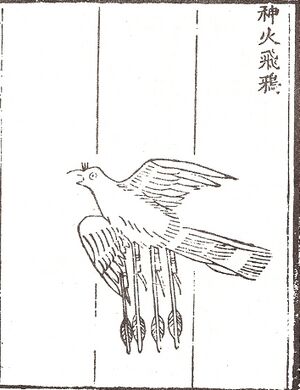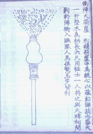 The first fire arrows were arrows strapped with gunpowder incendiaries but they eventually became gunpowder propelled projectiles (rockets). It's not certain when this happened. According to the History of Song, in 969 two Song generals, Yue Yifang and Feng Jisheng (馮繼升), invented a variant fire arrow which used gunpowder tubes as propellants.[24] These fire arrows were shown to the emperor in 970 when the head of a weapons manufacturing bureau sent Feng Jisheng to demonstrate the gunpowder arrow design, for which he was heavily rewarded. However Joseph Needham argues that rockets could not have existed before the 12th century, since the gunpowder formulas listed in the Wujing Zongyao are not suitable as rocket propellant.[25] According to Stephen G. Haw, there is only slight evidence that rockets existed prior to 1200 and it is more likely they were not produced or used for warfare until the latter half of the 13th century.[26] Rockets are recorded to have been used by the Song navy in a military exercise dated to 1245. Internal-combustion rocket propulsion is mentioned in a reference to 1264, recording that the 'ground-rat,' a type of firework, had frightened the Empress-Mother Gongsheng at a feast held in her honor by her son the Emperor Lizong.[27]