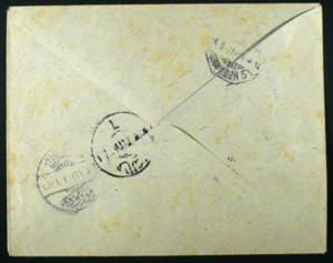 مغلف رسالة (خلفي) يعود لعام 1921، مدموغ بأختام عائدات سكة حديد الحجاز