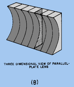 This "lens" converts the input spherical microwave radiation into parallel (collimated) lines in a given direction at the exit side of the microwave lens. The focusing action of the lens is accomplished by the refracting qualities of the metallic strip.