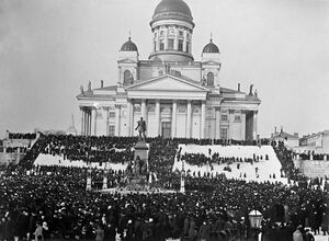 The policy of Russification of Finland (1899–1905 and 1908–1917, called sortokaudet/sortovuodet ('times/years of oppression') in Finnish) was the policy of the Russian czars designed to limit the special status of the Grand Duchy of Finland and more fully integrate it politically, militarily, and culturally into the empire.[40] Finns were strongly opposed and fought back by passive resistance and a strengthening of Finnish cultural identity.[41] Key provisions were, first, the February Manifesto of 1899 which asserted the imperial government's right to rule Finland without the consent of local legislative bodies; second, the Language Manifesto of 1900 which made Russian the language of administration of Finland; and third, the conscription law of 1901 which incorporated the Finnish army into the imperial army and sent conscripts away to Russian training camps.[42]
