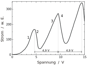 إذا قمنا بزيادة الجهد Ub, يبدأ التيار المقاس في الزيادة (1). وعند جهد معين (يعتمد على الغاز المستخدم) يبدأ التيار في الانخفاض عند (2) يصل التيار إلى حد أدنى ثم يرتفع ثانيا عند (3). وعند ضعف قيمة الجهد حيث ينخفض التيار أول مرة ، ينخفض مرة جديدة عند (4) ثم يزداد بعدها. ويتكرر ذلك دوريا ، وفي كل مرة يزيد التيار إلى قيمة أعلى عن سابقتها.