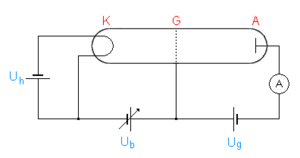 تتسرع الإلكترونات التي تنشأ على الكاثود (عن طريق التسخين الكهربي كما في فتيل المصباح) عند مرورها في المجال الكهربي الموجود بين الكاثود والشبكة ويصلوا عند الشبكة إلى أعلى سرعة لهم. ومعظم الغللكترونات سوف تحجزة الشبكة ويعودون بسبب الجهد Ub إلى الكاثود. ولكن قليل منهم سوف يمر من الشبكة وتبدأ حركتهم في التباطؤ بسبب الجهد العكسي الموجود بين الشبكة واللوح A (طريقة الجهد العكسي).