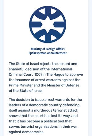 في 15 سبتمبر 2024، أصدرت وزارة الخارجية الإسرائيلية عن طريق الخطأ بيانا يدين إصدار المحكمة الجنائية الدولية أوامر اعتقال بحق رئيس الوزراء بنيامين نتنياهو ووزير دفاعه يوآڤ گالانت، رغم أن المحكمة لم تصدر بعد قراراً كهذا. نُشر البيان باللغة الإنگليزية لفترة وجيزة على الموقع الإلكتروني لوزارة الخارجية قبل حذفه بعد مشاركته على وسائل التواصل الاجتماعي، وفقا لصحيفة هآرتس الإسرائيلية التي أوردت الخبر. ونقلت هآرتس عن مسؤول في وزارة الخارجية الإسرائيلية قوله إن الحادث كان خطأ بشرياً، لكنه أقر بأن الوزارة تستعد لإمكانية إصدار أوامر الاعتقال قريبا، وهو ما دفعها لصياغة بيان إدانة بشكل مسبق، قبل أن يستدرك بأن إسرائيل مع ذلك لا تعرف ما إذا كانت المحكمة ستعلن قرارها أو متى.[84]