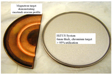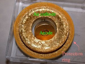 A typical ring-geometry sputter target, here gold showing the cathode made of the material to be deposited, the anode counter-electrode and an outer ring meant to prevent sputtering of the hearth that holds the target.