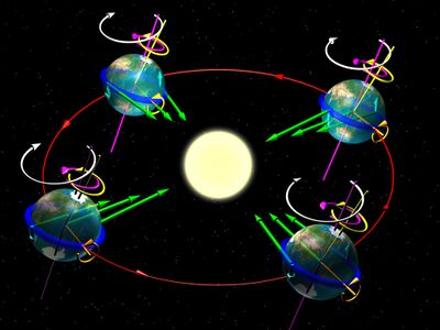 وتقدم الاعتدالين يحدث نتيجة دوران الارض في الفضاء مكونا مخروطا في نحو 25,800 سنة فقد كانت نقطة الاعتدال الربيعي حين إطلاق الاسماء على الكوكبات في برج الحمل ثم تراجعت غربا واصبحت الآن في برج الحوت.