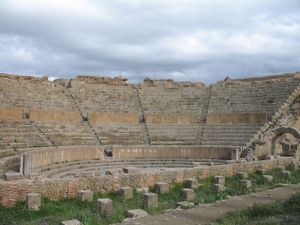 - ومن المرافق التي لا تزال آثارها واضحة للعيان الفوروم أو الساحة العمومية ويحيط بها المجلس البلدي ومعبد الإمبراطور وقصر العدالة إلى جانب السوق العمومي والمحلات التجارية، وغير بعيد عنها شُيد المسرح لإقامة التظاهرات الاحتفالية المختلفة.
