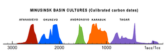 - ^ Svyatko, S. (2009). "New Radiocarbon Dates and a Review of the Chronology of Prehistoric Populations from the Minusinsk Basin, Southern Siberia, Russia". Radiocarbon. 2009 (1): 243–273 & appendix I p.266. Bibcode:2009Radcb..51..243S. doi:10.1017/S0033822200033798.