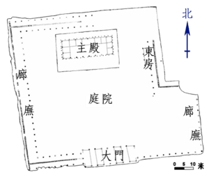 Discovered in 1959 by Xu Xusheng,[10] Erlitou is the largest site associated with the culture, with palace buildings and bronze smelting workshops. Erlitou monopolized the production of ritual bronze vessels, including the earliest recovered dings.[11] The city is on the Yi River, a tributary of the Luo River, which flows into the Yellow River. The city was 2.4 في 1.9 كيلومتر (1.5 في 1.2 mi); however, because of flood damage only 3 km2 (1.2 sq mi) are left.[9]