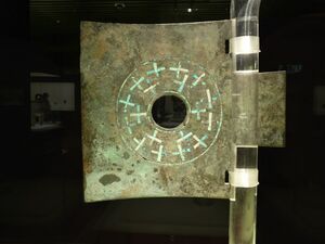 Many archetypal Chinese artifacts were first found in Erlitou culture sites. The earliest bronze ding in China were found in the fourth stage of the Erlitou culture, decorated with striped grid patterns.[23] The earliest metal bells, with one found in the Taosi site, and four in the Erlitou site, dated to about 2000 BC, may have been derived from the earlier pottery prototype.[24] The first bronze dagger-axe or ge appeared at the Erlitou site,[25] where two were found among over 200 bronze artifacts (as of 2002) at the site.[26] Three jade ge were also discovered from the same site.[27]