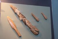 Cucuteni–Trypillia tools were made from knapped and polished stone, organic materials (bone, antler and horn), and in the later period, copper. Local Miorcani flint was the most common material for stone tools, but a number of other types are known to have been used, including chert, jasper and obsidian. Presumably these tools were hafted with wood, but this is not preserved. Weapons are rare but not unknown, implying the culture was relatively peaceful.[75]