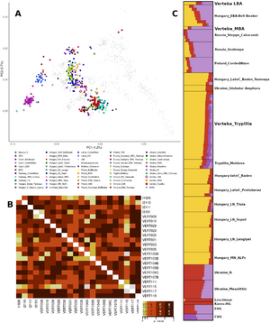 87. ^ Gelabert, Pere (4 May 2022). "Genomes from Verteba cave suggest diversity within the Trypillians in Ukraine". Scientific Reports (in الإنجليزية). 12 (1): 7242. Bibcode:2022NatSR..12.7242G. doi:10.1038/s41598-022-11117-8. ISSN 2045-2322. PMC 9068698. PMID 35508651. "Results reveal that the CTCC individuals' ancestry is related to both western hunter-gatherers and Near Eastern farmers, has no local ancestry associated with Ukrainian Neolithic hunter-gatherers and has steppe ancestry...In fact, most of the Trypillian individuals can be modeled by Eneolithic populations from Europe that have steppe ancestry, however four out of the 20 individuals could be modeled as Moldovan Trypillians."