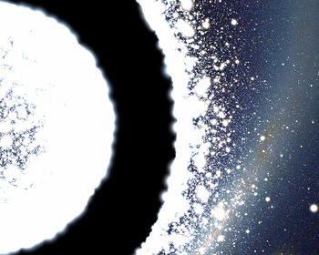 Artist's impression of the wormhole as seen by an observer crossing the event horizon of a Schwarzschild wormhole, which is similar to a Schwarzschild black hole but with the singularity replaced by an unstable path to a white hole in another universe. The observer originates from the right, and another universe becomes visible in the center of the wormhole shadow once the horizon is crossed. This new region is, however, unreachable in the case of a Schwarzschild wormhole, as the bridge between the black hole and white hole will always collapse before the observer has time to cross it. See White Holes and Wormholes for a more technical discussion and an animation of what an observer sees when falling into a Schwarzschild wormhole.