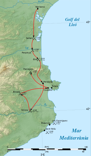 In the summer of 1285, the French crusader army under Philip and Charles of Valois entered Roussillon. Contemporary chronicles listed a huge force of between 80,000 and 100,000 men, while more modern sources estimate the size of the army as being around 1,500 mounted cavalry and 6,500–8,000 infantry.[26][27] Regardless of size, sources have described the army as one of the largest assembled by France in the 13th century, possibly the largest French expedition into Iberia since the time of Charlemagne.[26] Though the French had James of Majorca's support, the local populace rose against them and did not allow a quick French passage. When the French army reached the city of Elne, the city refused to open its gates. Elne was valiantly defended by the so-called bâtard de Roussillon ("bastard of Roussillon"), the illegitimate son of Nuño Sánchez, late count of Roussillon. Eventually the city was overcome and brutally sacked, with the French then continuing their advance south. Local nobles conducted a scorched earth campaign against the French, prompting Philip to order his army to isolate any Aragonese garrison they encountered and continue south quickly, fearful of running out of supplies. Peter and the Aragonese army fell back from the frontier, not willing to risk attacking the larger French army - Peter was also awaiting the return of the men and ships he had fighting in Sicily.[3][24]