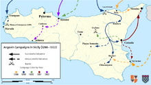 In February 1300, an advance force of 300 Angevin knights, lured by the promise of a weak fortress at Gagliano, were destroyed in a Sicilian ambush at the Battle of Gagliano, further blunting Robert's ability to advance in Sicily.[33] While the ground campaign stalled, on 14 June 1300 Roger of Lauria and the allied fleet defeated the Sicilians at the Battle of Ponza, crippling the Sicilian navy and relegating it to small-scale attacks.[3][33] The allied fleet sailed to the south coast of Sicily, raiding towns and castles but failing to land additional allied troops.[33]