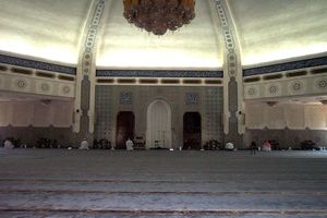 ويتميز بيت الصلاة من الداخل بغلبة اللونين الأبيض والأزرق عليه، وإن كان يعيبه كثرة الزخارف الملونة المصنوعة من الفسيفساء المغربية (الزليج) التي تغطي الجدران حتى ارتفاع مترين، وتغطي جدار القبلة حتى ارتفاع 5 أمتار، كما تغطي أعصاب القبة من الداخل حتى نهايتها، وهذا مكروه شرعيا.كما أن المنبر فيه لا يتخذ صورة المنبر النبوي المكون من سلم ذي ثلاث درجات ، لكن على شكل شرفة يصعد إليها من الخلف، وهذا مشابه لتصميم منصات الخطابة في المسارح ومنابر الكنائس. وهو أمر مكروه أيضا.