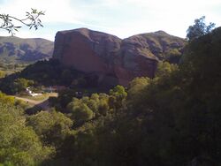 Foothill dry forest, known as Chaco Serrano, extends from 500 to 1300 meters elevation. Lithraea molleoides and Zanthoxylum coco are the predominant trees on the eastern slopes, with Schinopsis haenkeana dominant on the dry western slopes. Romerillal shrubland is found between 1300 and 1700 meters elevation, characterized by the shrub Heterothalamus alienus. Grasslands of Festuca hieronymi and species of Stipa and Piptochaetium are found between 1500 and 1850 meters elevation.[2] Forests and woodlands of tabaquillo (Polylepis australis) are found in sheltered ravines and stream valleys and canyon bottoms with access to year-round moisture. Polylepis australis is typical of the eastern Andes, and the Sierras de Córdoba are the eastern and southern extent of its range. Other species of the Polylepis woodlands include the tree Maytenus boaria and the shrubs Escallonia cordobensis, Berberis hieronimii, Satureja spp., and the dwarf shrub Gaultheria poeppigii.[4]