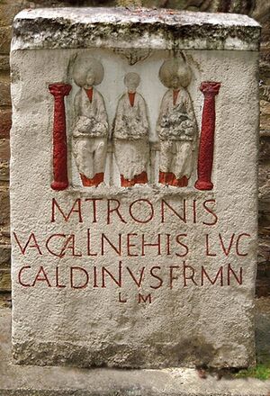 - West Germanic: including Old Saxon (attested from the 5th c. CE), Old English (late 5th c.), Old Frisian (6th c.), Frankish (6th c.), Old High German (6th c.), and possibly Langobardic (6th c.), which is only scarcely attested;[101] they are mainly characterized by the loss of the final consonant -z (attested from the late 3rd century),[102] and by the j-consonant gemination (attested from ca. 400 BCE);[103] early inscriptions from the West Germanic areas found on altars where votive offerings were made to the Matronae Vacallinehae (Matrons of Vacallina) in the Rhineland dated to ca. 160–260 CE; West Germanic remained a "residual" dialect continuum until the Anglo-Saxon migrations in the 5th–6th centuries CE;[93]