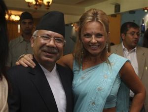 صندوق الأمم المتحدة للسكان، المغنية البريطانية جري هاليويل، مع رئيس ورزاء نيبال مداف كومار في حفل غداء في حملة إنهاء التمييز النوعي القائم على العنف في كتماندو، نيبال، الأربعاء 3 سبتمبر، 2009. [2].