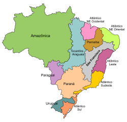 According to organs of the Brazilian government there are 12 major hydrographic regions in Brazil. Seven of these are river basins named after their main rivers; the other five are groupings of various river basins in areas which have no dominant river.