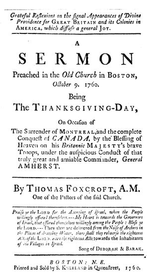 The Lord hath done great things for us, whereof we are glad... Long had it been the common opinion, Delenda est Carthago, Canada must be conquered, or we could hope for no lasting quiet in these parts; and now, through the good hand of our God upon us, we see the happy day of its accomplishment. We behold His Majesty's victorious troops treading upon the high places of the enemy, their last fortress delivered up, and the whole country surrendered to the King of Britain in the person of his general, the intrepid, the serene, the successful Amherst.