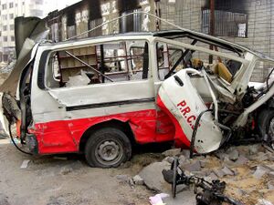 Destroyed ambulance in the city of Shuja'iyya in the Gaza Strip after Israeli Shelling, Al-Quds Hospital