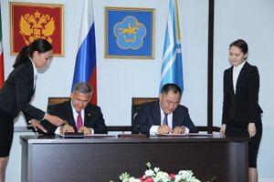 Tuva was a signatory to the 31 March 1992 treaty that created the Russian Federation. On 22 October 1993, a new constitution was drawn up for the republic, creating a 32-member parliament (Supreme Khural) and a Grand Khural, which deals with local legislation.[24] The constitution was approved by 53.9% (62.2% according to another source) of Tuvans in a referendum on 12 December 1993.[25] At the same time, the official name was changed from Tuva (Тува) to Tyva (Тыва).[26]