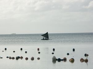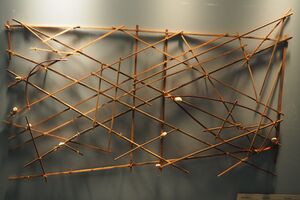 The Marshallese sailed between islands on walaps made from breadfruit-tree wood and coconut-fiber rope.[21] They navigated by using the stars for orientation and initial course setting, but also developed a piloting technique of interpreting disruptions in ocean swells to determine the location of low coral atolls below the horizon.[22] They noticed that swells refracted around the undersea slope of atolls. When refracted swells from different directions met, they created noticeable disruption patterns, which Marshallese pilots could read to determine the direction of an island.[23] When interviewed by anthropologists, some Marshallese sailors noted that they piloted their canoes by both sight and feeling changes in the motion of the boat.[20] Sailors also invented stick charts to map the swell patterns, but unlike western navigational charts, the Marshallese stick charts were tools for teaching students and for consultation before embarking on a voyage; navigators did not take charts with them when they set sail.[24]