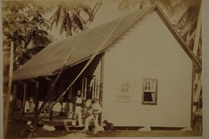In 1857, American Board of Commissioners for Foreign Missions sent two families to establish a mission church and school at Ebon. By 1875, the missionaries had established churches on five atolls and had baptized more than 200 islanders,[41] and one traveler noted that most women on Ebon wore western clothes and many men wore trousers by the mid-1870s.[42]