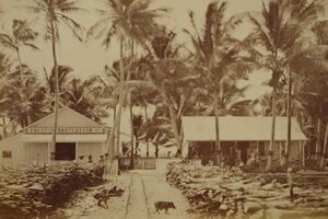 In 1859, Adolph Capelle and another merchant arrived at Ebon and set up a trading post for the German company Hoffschlaeger & Stapenhorst.[43] When the firm went bankrupt in 1863, Capelle partnered with Portuguese ex-whaler Anton Jose DeBrum to establish a copra trading firm: Capelle & Co.[44] In 1873, the company moved its headquarters to Jaluit, the home of Kabua, a powerful iroij and disputed successor for the paramount chieftainship of the southern Ralik Chain.[45] In the 1870s, various other companies from Germany, Hawaii, New Zealand, and the United States engaged in the copra trade in the Marshall Islands.[46] By 1885, the German firms Hernsheim & Co. and Deutsche Handels- und Plantagen-Gesellschaft Der Südee Inseln zu Hamburg controlled two-thirds of the trade.[47]