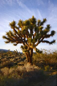 The most northwest portion of the American Southwest is covered by the Mojave Desert. Bordered on the south by the Sonoran Desert and the east by the Colorado Plateau, its range within the region makes up the southeast tip of Nevada, the southwestern corner of Utah and the northwestern corner of Arizona.[24] In terms of topography, the Mojave is very similar to the Great Basin Desert, which lies just to its north.[20] Within the region, Las Vegas is the most populous city; other significant population centers include Laughlin and Pahrump in Nevada, St. George and Hurricane in Utah, and Lake Havasu City, Kingman, and Bullhead City in Arizona. The Mojave is the smallest, driest and hottest desert within the United States.[24] The Mojave gets less than 6 in (150 mm) of rain annually, and its elevation ranges from 3،000 إلى 6،000 أقدام (900 إلى 1،800 متر) above sea level.[26] The most prolific vegetation is the tall Joshua tree, which grow as tall as 40 ft (12 m), and are thought to live almost 1000 years.[24] Other major vegetation includes the Parry saltbush and the Mojave sage, both only found in the Mojave, as well as the creosote bush.[27]
