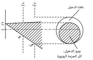 لتكن في الشكل -3 ي نقطة من حافة بؤبؤ الدخول و ص نقطة من حافة نافذة الدخول، وج نقطة تقاطع المستقيم ي ص مع مستوي الجسم. واضح أن جميع الحزم البؤبؤية المنطلقة من نقاط واقعة بين ب وج (ومن النقاط المناظرة لها بالنسبة إلى ب) هي حزم مفيدة لأنها تمر كلها من نافذة الدخول فلا تصطدم، لدى اختراقها الآلة، لا بجدار كوة الفتحة ولا بجدار كوة الحقل؛ وعلى هذا الأساس يطلق على الدائرة الموجودة في مستوي الجسم والتي مركزها ب ونصف قطرها ب ج اسم حقل الضوء التام.