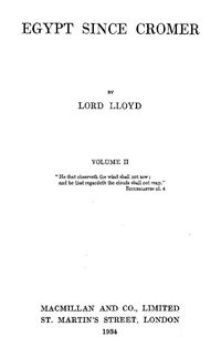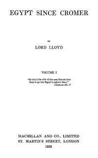 عاد جورج لويد إلى البرلمان مرة أخرى عن دائرة Eastbourne in 1924 and served until 1925, when he was made Baron Lloyd, of Dolobran in the County of Montgomery, named after his Welsh ancestral home.[12] After his ennoblement, he was appointed High Commissioner to Egypt and served until his resignation was forced upon him by the Labour Foreign Secretary Arthur Henderson in 1929. Lloyd's views and experience formed the background of a self-justifying two-volume book, مصر منذ كرومر (published 1933–1934).[12]