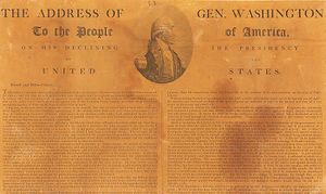 كانت خطبة وداع واشنطن (صدرت كرسالة رسمية عام 1796) واحدة من أكثر البيانات الجمهورياتية تأثيراً . صاغها بشكل رئيسي واشنطن نفسه، وساعده هاملتون، أعطت دليلاً على الإحتياج وأهمية الوحدة الوحدية، قيمة الدستور ودور القانون، شرور الأحزاب السياسية، والفضائل الحقيقية للشعب الجمهوري. طالب أخلاقياً "بالروح المطلوبة من أجل الحكومة الشعبية" قال، "بصرف النظر عن كل ما تم التنازل عنه من أجل تأثير التعليم الراقي على عقول البنية المميزة، فإن السبب والتجربة تسمح لها بتوقع أن الأخلاق الوطنية يمكنها أن تسود في غياب المبدأ الديني."[42]