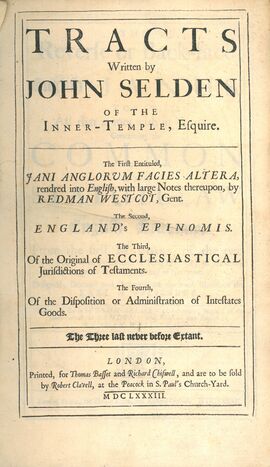 - ^ The Epinomis (باليونانية Ἐπινομίς) هو اسم أحد محاورات أفلاطون، التي كان ملحقة بكتابه القوانين (باليونانية Νόμοι, Nomoi). ولذلك، فالعنوان England's Epinomis indicates that the work is an appendix to Selden's Jani Anglorum Facies Altera.