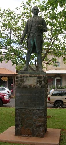 A statue of James Cook stands in Waimea, Kauai commemorating his first contact with the Hawaiian Islands at the town's harbour on January 1778