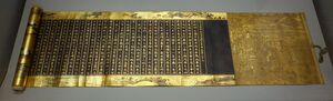 For Zhiyi, this ultimate non-dual teaching is the unique teaching only found in the Sublime Dharma Lotus Sutra, and is the essential meaning of the title.[25] This means that while the Lotus is superior to all other sutras from a relative point of view, it is also one with the teachings of all sutras, which are identical to the Lotus from an absolute perspective.[25] All other sutras and teachings are thus expressions or modes of the Lotus Sutra's complete teaching. The Lotus is also the master key that "unlocks" the true meaning of all other teachings (which is none other than the Lotus Sutra's teaching of the unity of all teachings and all phenomena). Thus, the Lotus Sutra shows that all other sutras are really also the Lotus Sutra, i.e. the Buddha-wisdom of the non-duality of all things.[29] The idea of the "round/ perfect teaching" (yuanjiao) does not originate with Zhiyi, and can be found in previous writings of Baoliang (444–509) and Huiguang (468–537). Zhiyi's unique contribution is in his adapting the term to signify the all-encompassing non-dual nature of the Buddha's teaching in the Lotus Sutra.[28]
