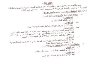 1- يُمنع تواجد أي أفراد/عربات أو تحرك أي وسائل انتقال بكافة أنواعها وأشكالها (فوق/تحت الأرض) عدا أفراد وعربات ومعدات القوات المسلحة وذلك بالمنطقة المحددة بالخريطة المرفقة بهذا القرار.